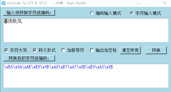 在字符输入模式下,则直接输入字符即可将中文字符转换为UTF-8编码,例如:输入“暮雨秋风”,点击转换则直接输出转换后的UTF-8编码“e69aaee99ba8e7a78be9a38e”。