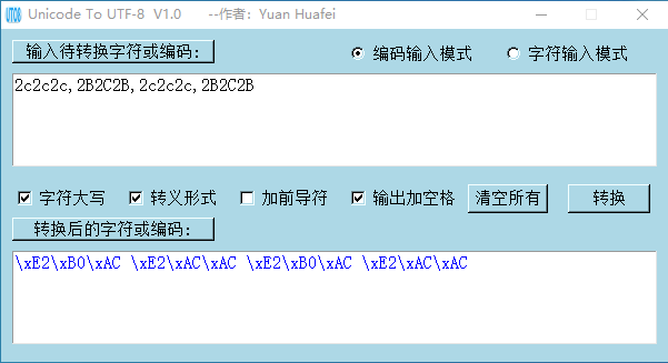 (3)【加前导符】选中后输出将会加上前导符“0x”,即“0xe2b0ac”,【转义形式】被选中后此选项将不会生效。